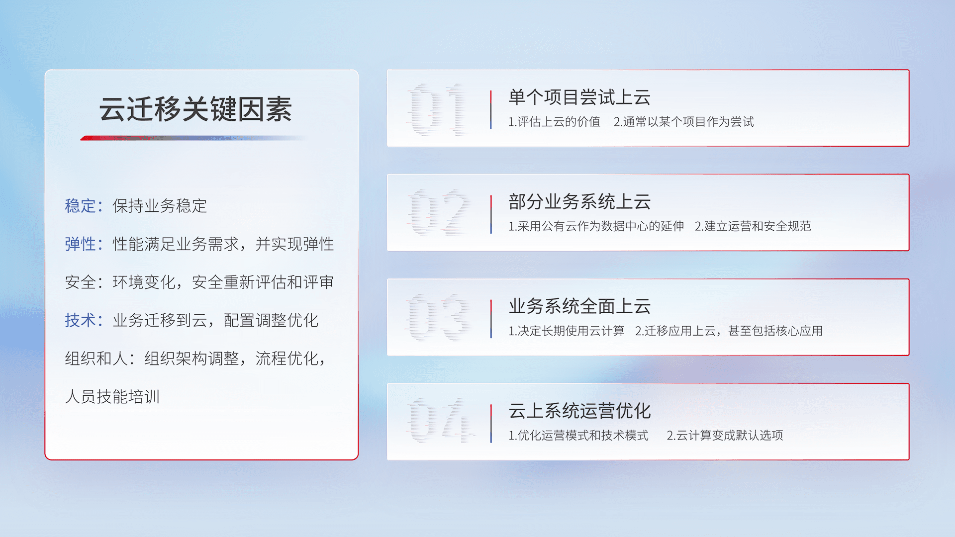 结合实际业务,,,从规划设计、、云平台选型、、、云原生改造、、、、数据迁移、、集成交付,,,,迁移全过程为客户识别最佳上云路径,,做好风险识别管理,,,设计网络架构、、、身份权限、、、安全审计合规、、、操作审计、、日志审计、、监控告警策略、、、多站点容灾设计等,,,,对云上基础设施进行整体规划,,提升IT治理水平,,,,以满足弹性、、、、高可用、、、高性能的需求。。。